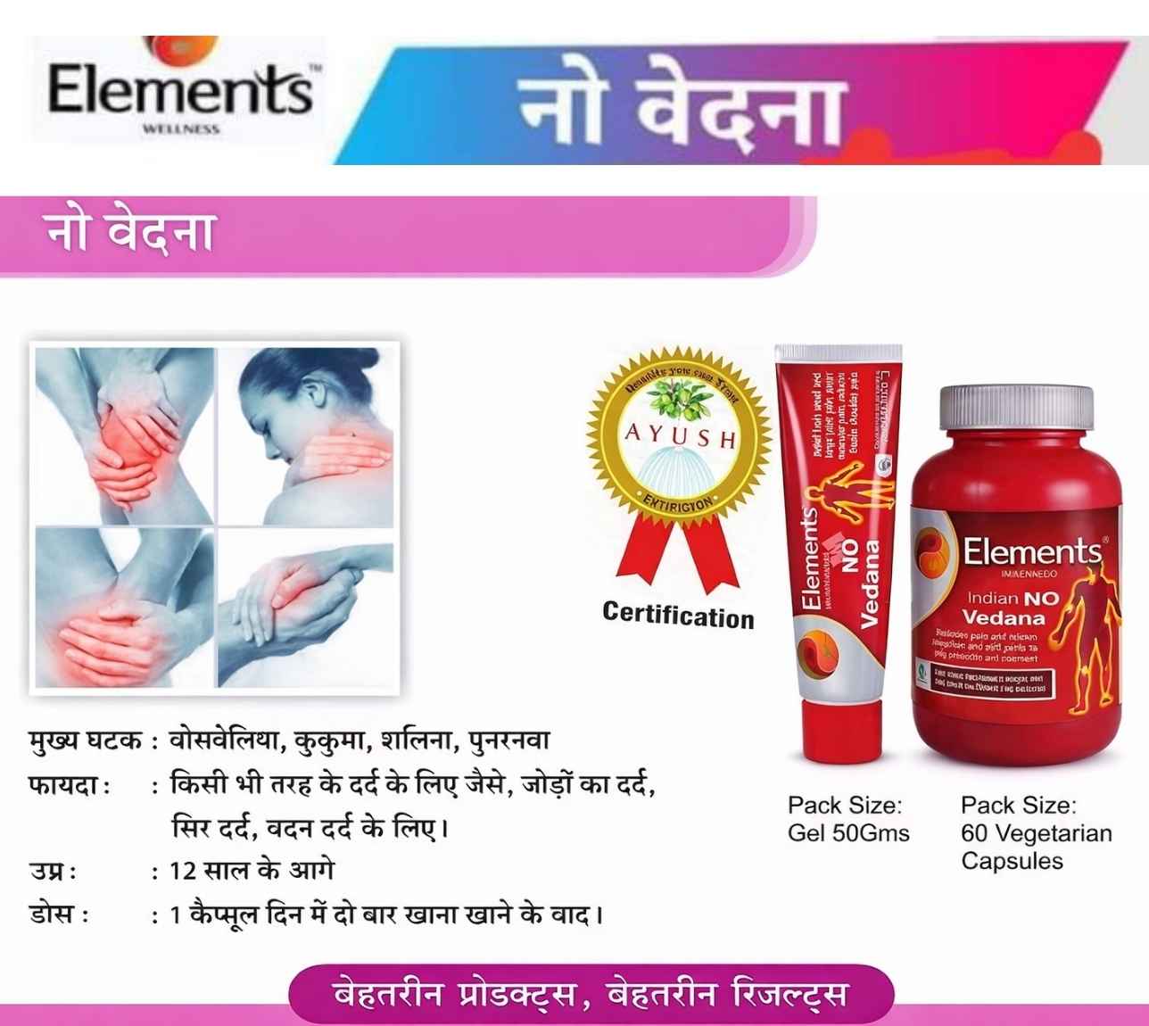 Elements Wellness No Vedna 60 Veg Capsules is a proprietary Ayurvedic supplement designed to help provide relief from aches, pains, and discomfort associated with muscular strain, joint soreness, body stiffness, and general fatigue.* The herbal blend works by supporting normal muscle relaxation and joint comfort, while promoting circulation and tissue nourishment.*