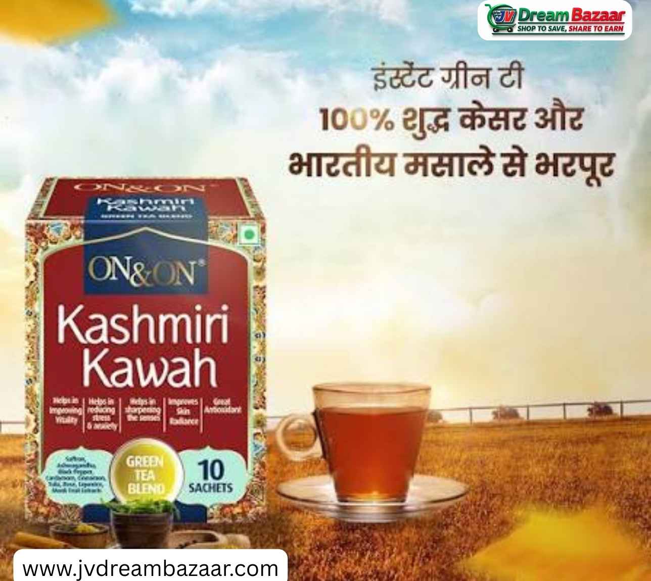 On & On Kashmiri Kawa Green Tea is a refreshing and aromatic herbal tea that blends the antioxidant benefits of green tea with traditional Kashmiri spices — such as saffron, cardamom, cinnamon, cloves, and ginger — used for centuries in Kashmiri kawa tea. This unique combination offers a flavorful experience while providing wellness benefits associated with both green tea and classic Indian spices.*