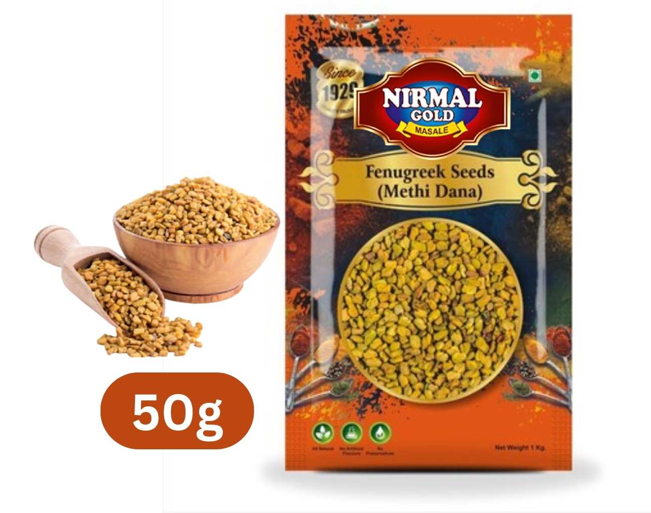 Nirmal Gold Methi Dana 50GM Pouch Pack contains carefully selected premium whole fenugreek seeds known for their distinctive aroma and mildly bitter, nutty flavor.