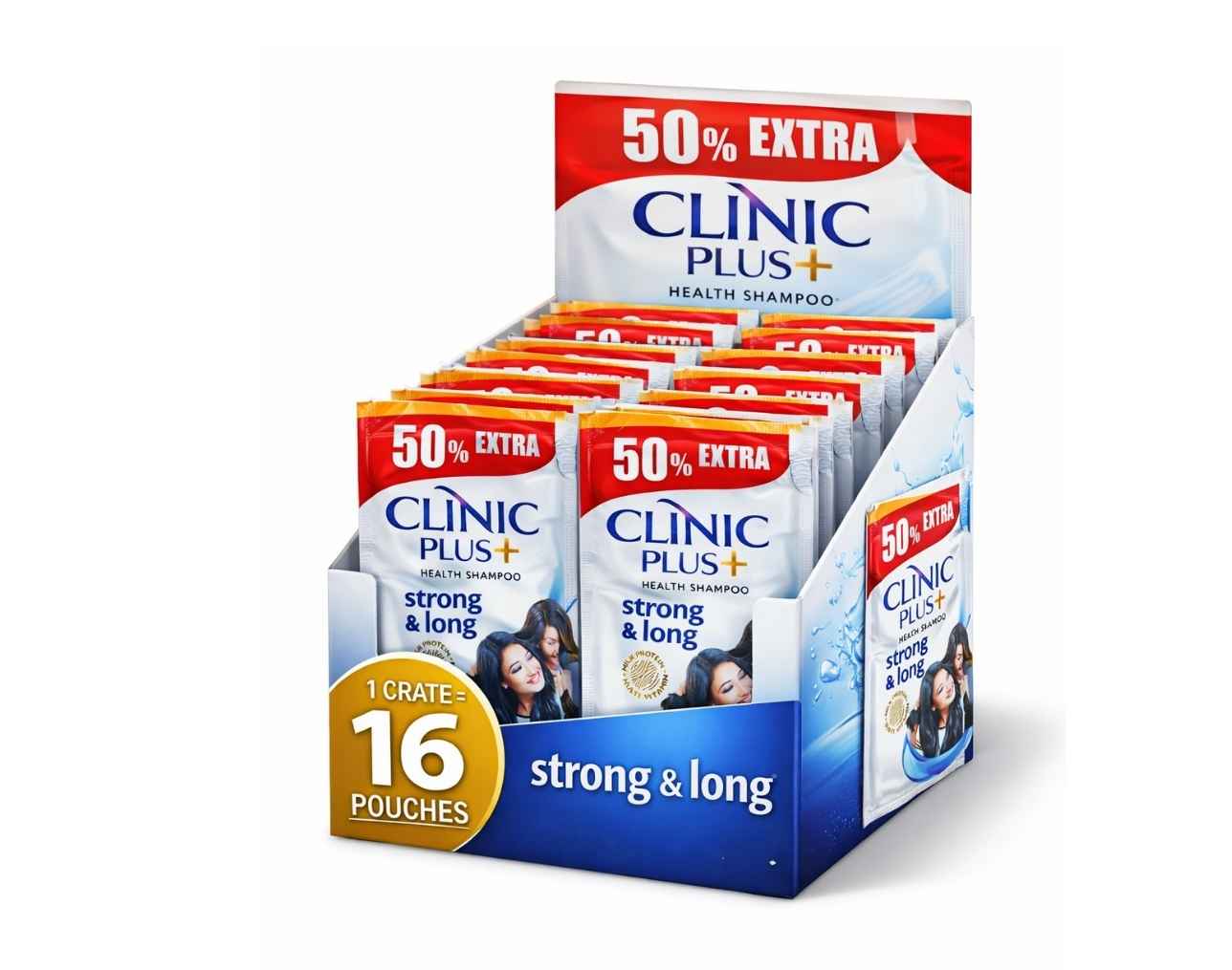 clinic plus shampoo pack of 16, clinic plus sachet bundle, strong and long shampoo pack, shampoo retail counter pack, daily use shampoo sachet multipack
