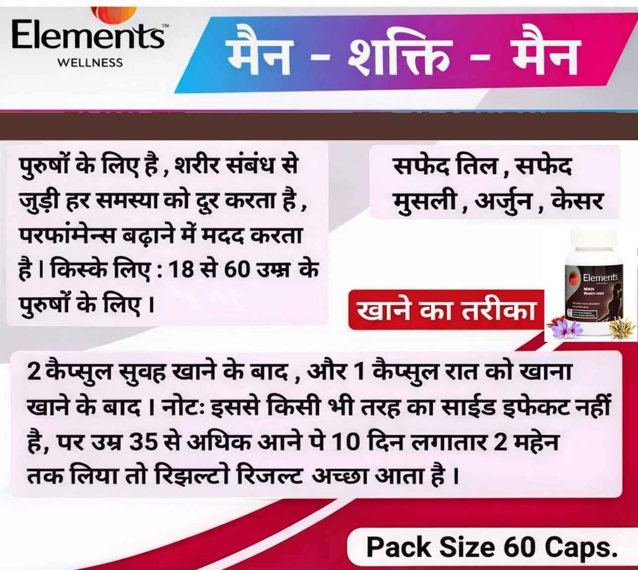 Elements Man Shakti‑Man Capsules is a proprietary Ayurvedic supplement crafted to support male health and vitality. It combines several herbal extracts known in traditional Ayurveda to help with endothelial function, circulation, stress reduction, libido, and physical energy.* The formulation is aimed to help men feel more confident, active, and balanced.